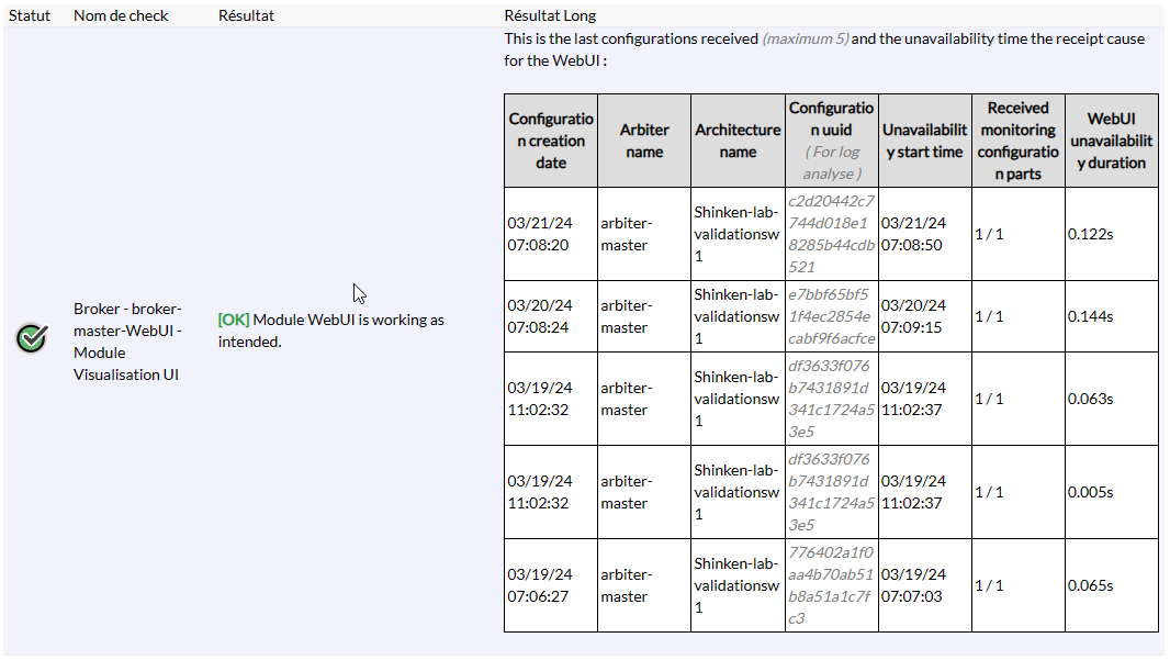 Le check Broker - $KEY$ - Module Visualisation UI va afficher l'état d'une WebUI ainsi que les dernières configurations qu'elle a reçues