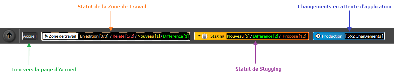 - en statut de stagging : 5 nouveaux éléments (dont 1 cluster, 2 Check et 2 Utilisateurs), 2 différence sur les modulations et 12 propositions de modifications sur les hôtes provenant de la Zone de travail.
