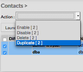 To duplicate a contact, first go on the Main page listing all contacts,then select a contact by clicking on the check box placed on the first column.