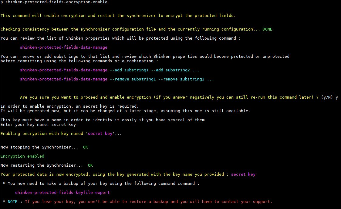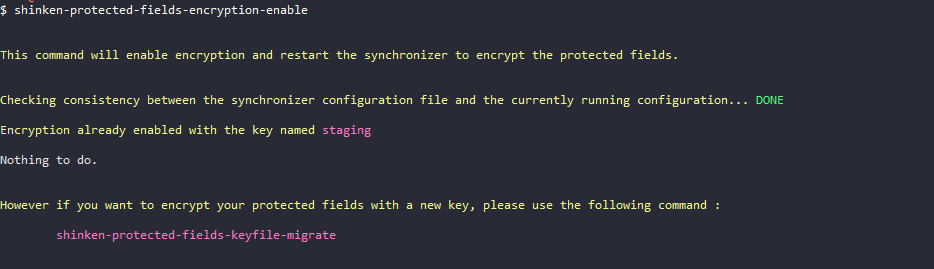 Si le chiffrement est déjà activé, le lancement de la commande shinken-protected-fields-encryption-enable décrira le processus permettant de migrer la base vers une nouvelle clé de chiffrement.