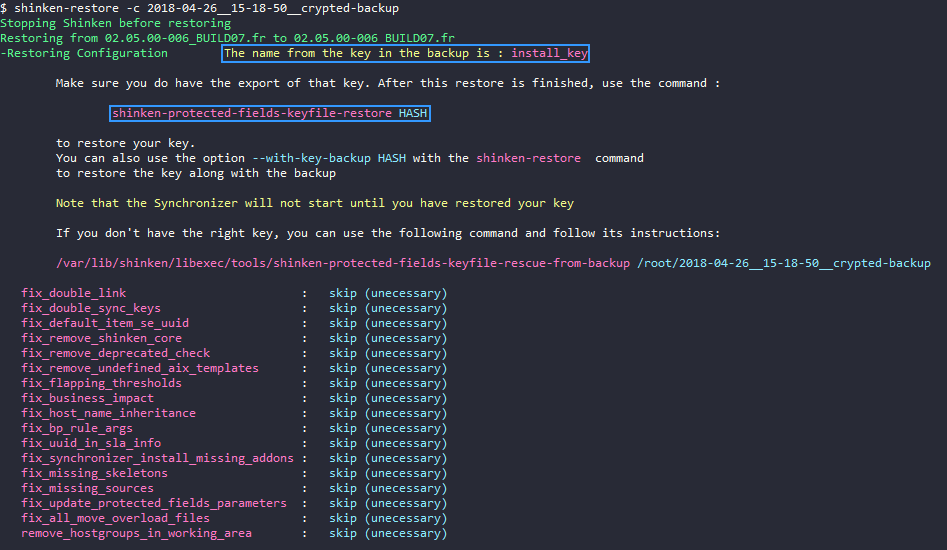 root@vm-shinken: ~/shinken-backups $ shinken-restore --configuration 2017-11-08__10-58-54 Stopping Shinken before restoring Restoring from 02.04.01-release to 02.04.02-release -Restoring Configuration DONE Sanatizing your restored data fix_double_link : executed [OK] fix_double_sync_keys : skip (unecessary) fix_default_item_se_uuid : skip (unecessary) fix_remove_shinken_core : skip (unecessary) fix_remove_deprecated_check : skip (unecessary) fix_remove_undefined_aix_templates : skip (unecessary) fix_flapping_thresholds : skip (unecessary) fix_business_impact : skip (unecessary) Done. You can restart your shinken with /etc/init.d/shinken start
