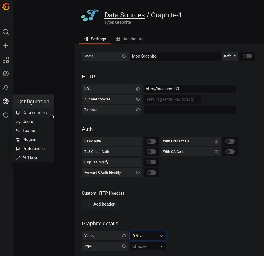 Dans l'interface, aller dans la catégorie Data Sources , puis ajouter une nouvelle source de type Graphite, qui sera paramétrée comme suivant: