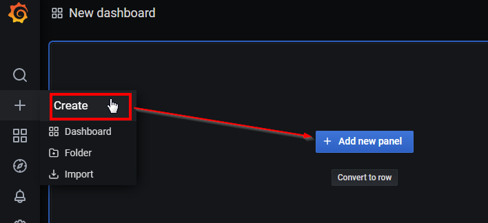 - Cliquer sur le "+", "Create", puis "Add new panel".
