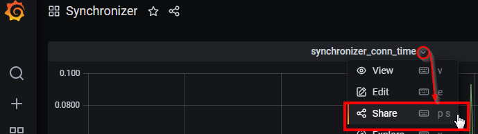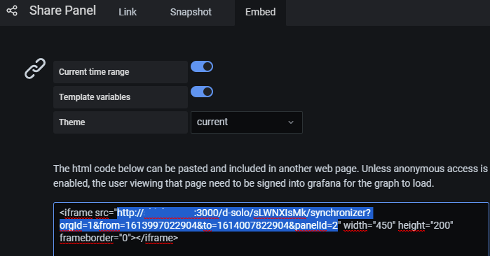 Exemple :http://adresse_serveur:3000/d-solo/sLWNXIsMk/synchronizer?orgId=1&from=now-6h&to=now&panelId=2