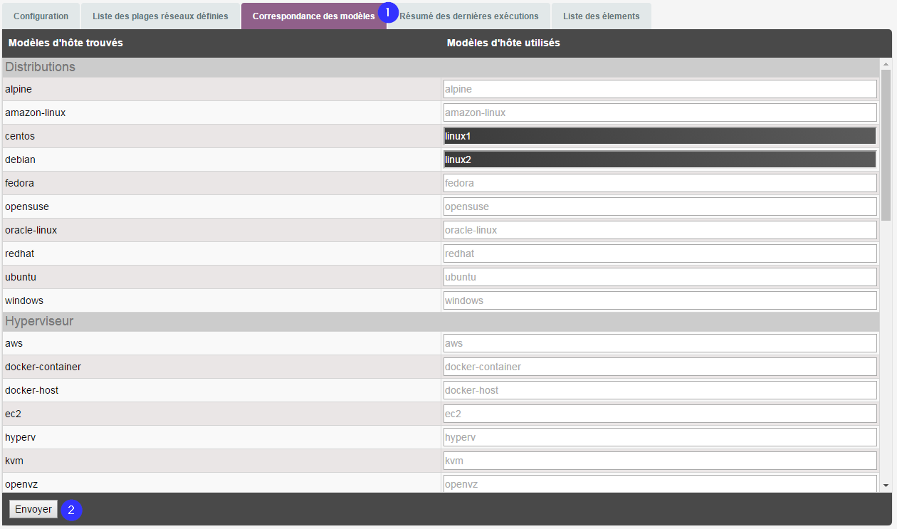Des associations sont déjà réalisées par défaut : les champs par défaut sont ceux surlignés en blanc avec un texte gris. Les champs surlignés en noir, sont les champs qui ont été défini par l'utilisateur. Pour les modifier, il suffit de saisir le nom d'un modèle dans la ligne correspondante et cliquer sur Envoyer (2) en bas de la page.