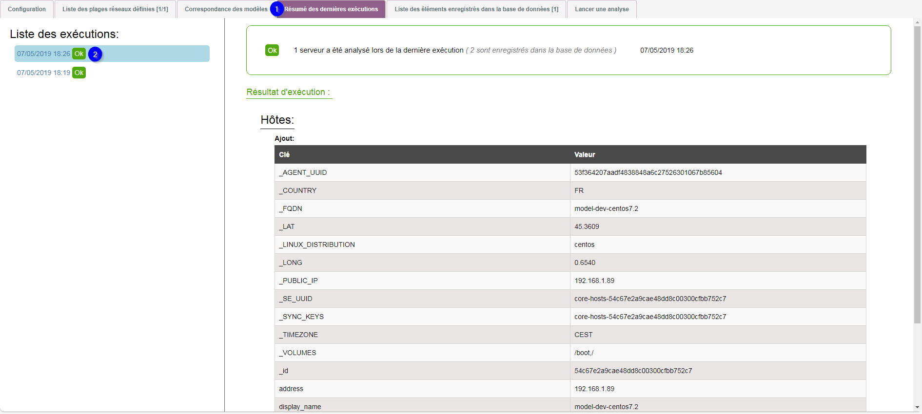 Cette partie est accessible depuis l'onglet Résumé des dernières exécutions (1).