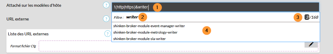 Cliquer sur le champ (1) pour faire apparaître le menu déroulant (4) afin de sélectionner un ou plusieurs modèles d'hôtes ( ou clusters ).