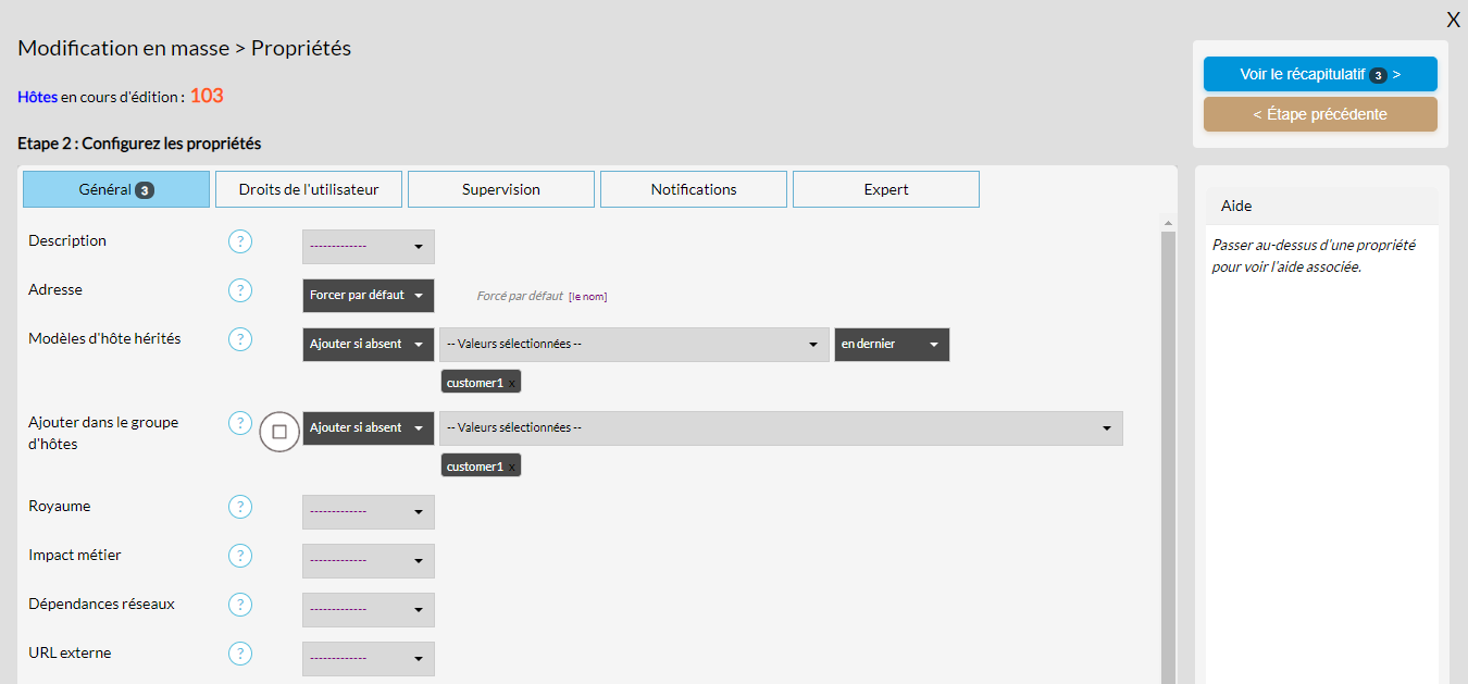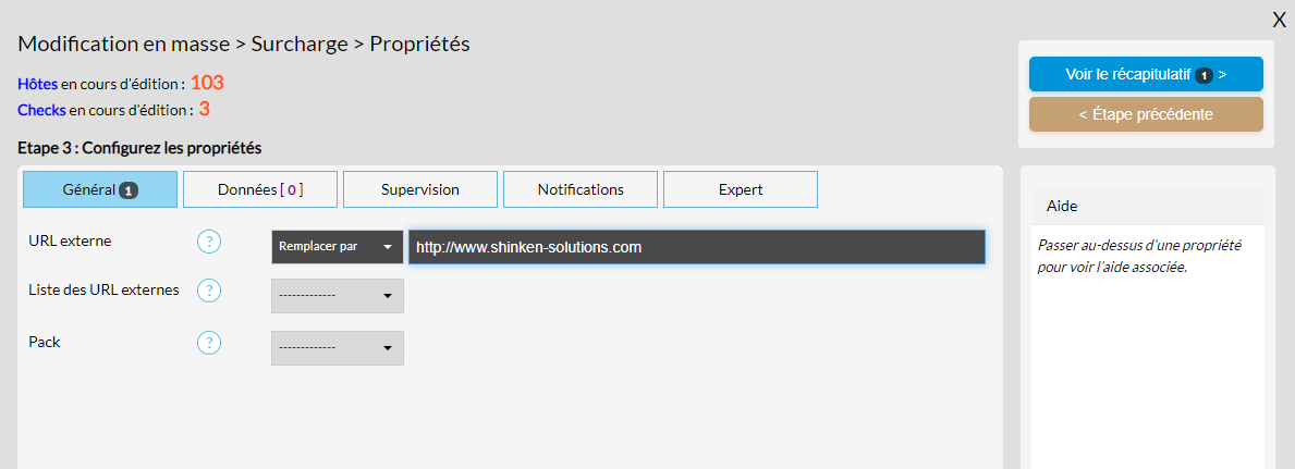 - La zone d'aide située sous ces boutons "Voir le récapitulatif " ou "É tape précédente " fonctionne de la même manière que pour l'édition d'un élément. C'est-à-dire qu'il affiche l'aide d'une propriété en la survolant avec la souris ou en cliquant sur le bouton "?".