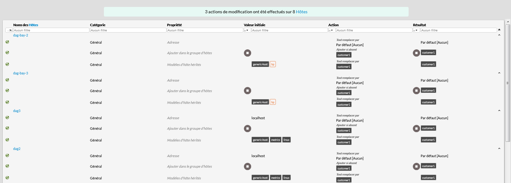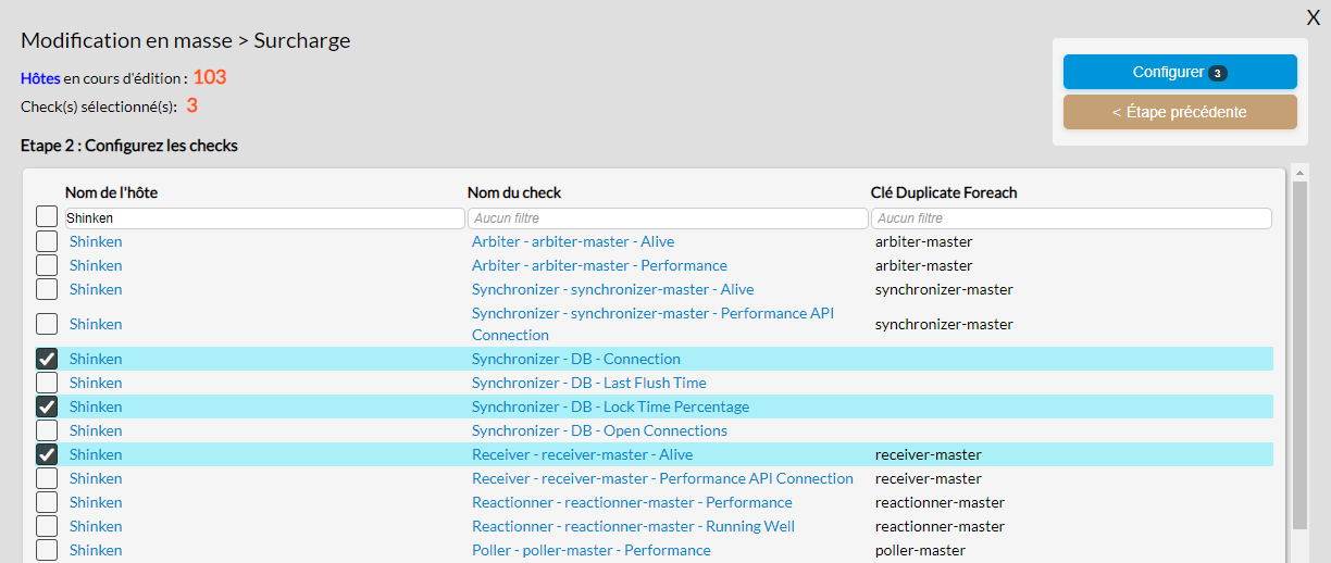 - Il est possible de filtrer la liste en saisissant votre filtre dans les champs situés dans l'entête de chaque colonne ( Nom de l'hôte, Nom du check et Clé Duplicate Foreach )