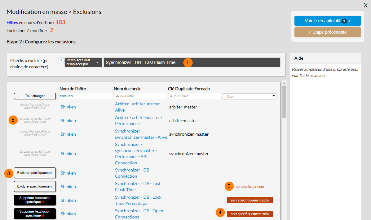 Les checks concernés par cette exclusion apparaîtront avec le label "sera exclu par nom" (2) dans la dernière colonne de la liste. - Il est possible aussi d'exclure spécifiquement un check en cliquant soit sur le bouton "Exclure spécifiquement " (3) situé sur la ligne du check , soit sur la liste du check.