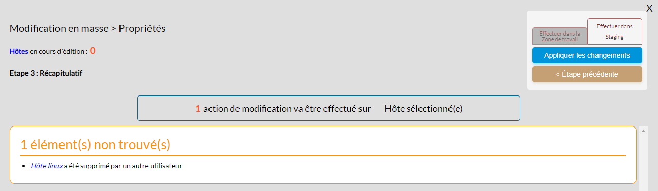 Comme pour l'étape 3, si un élément est supprimé avant ou au moment de l'application des modifications, un message d'avertissement indique que l'élément n'existe plus
