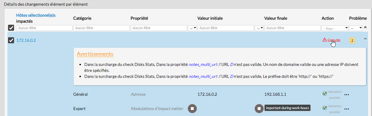 Dans la liste, le détail des problèmes est affichable en cliquant sur le bouton "Consulter" situé sur la ligne de l'élément ayant un changement posant problème.