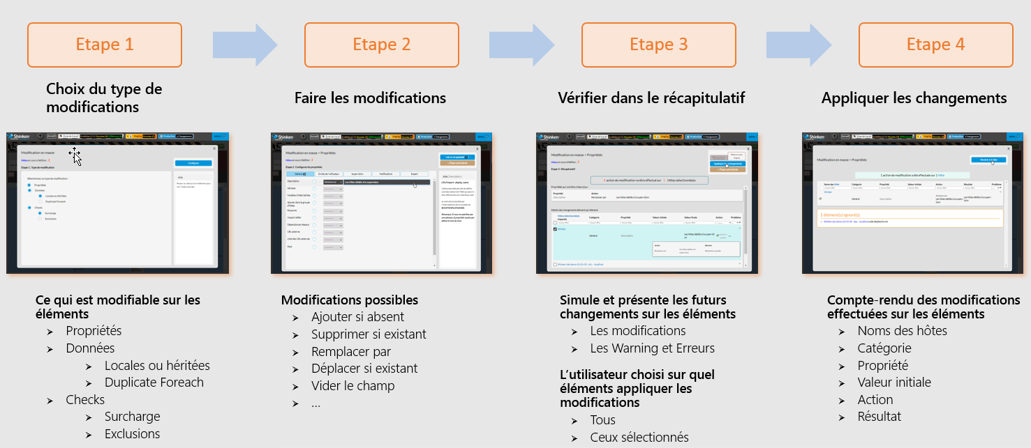 L'édition de masse permet d'appliquer des modifications sur un grand nombre d'éléments sélectionnés du même type. L'édition en masse s'effectue en plusieurs étapes :