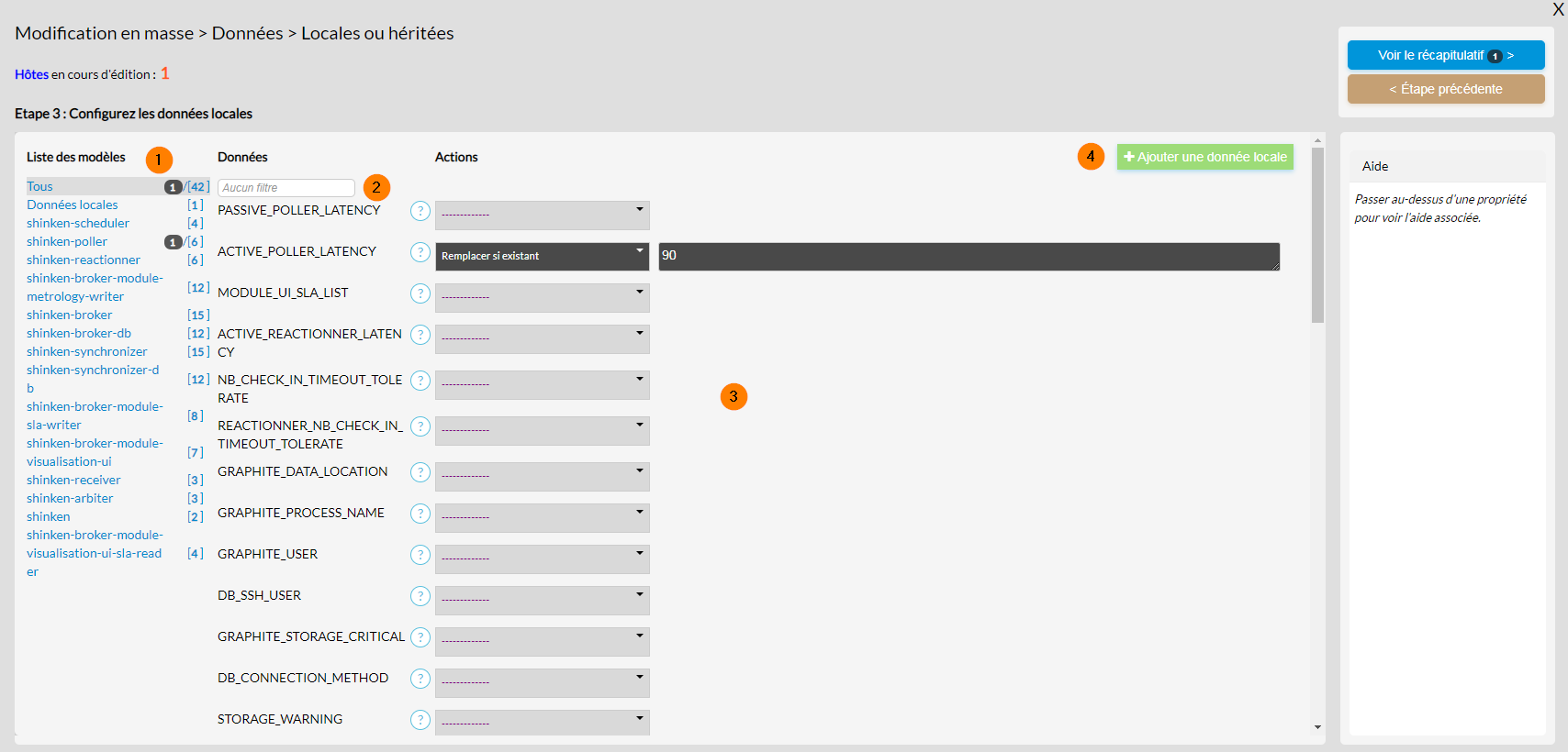 - Il est possible de rajouter une donnée locale sur tous les éléments sélectionnés, en cliquant sur le bouton "Ajouter une donnée locale" (4) . Les nouvelles données apparaissent et peuvent être supprimées à l'aide de la croix rouge située au début de la ligne.