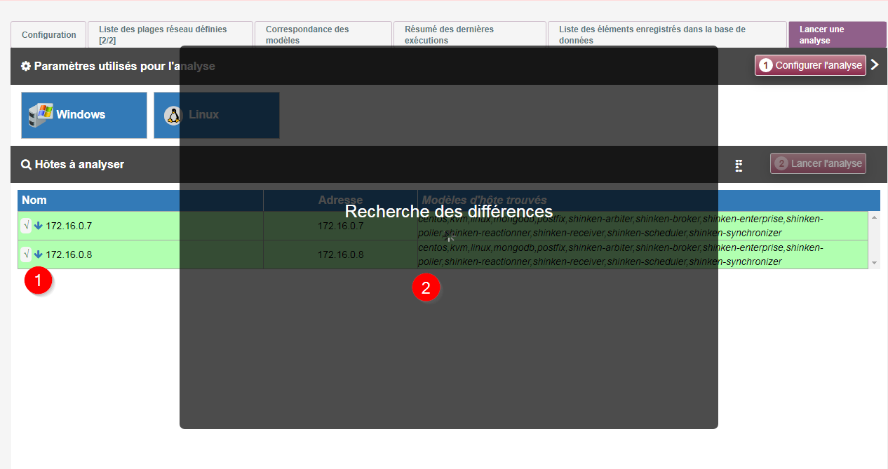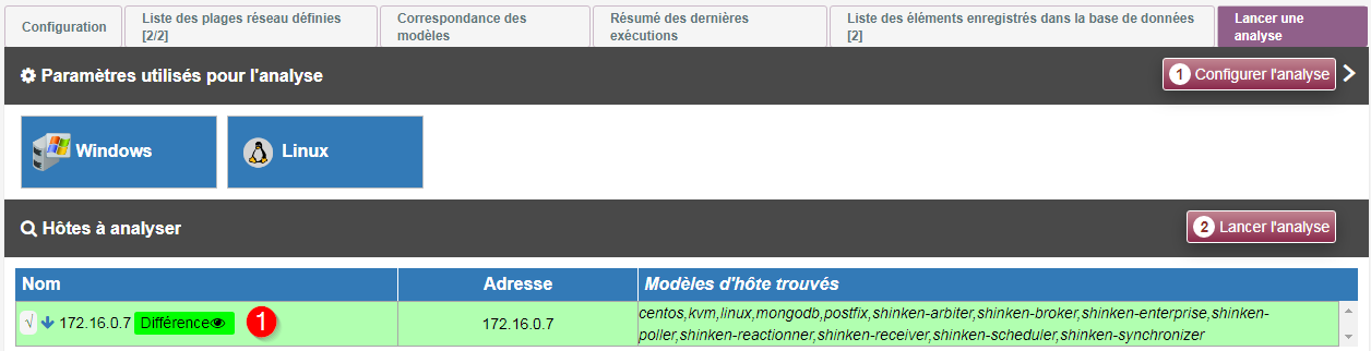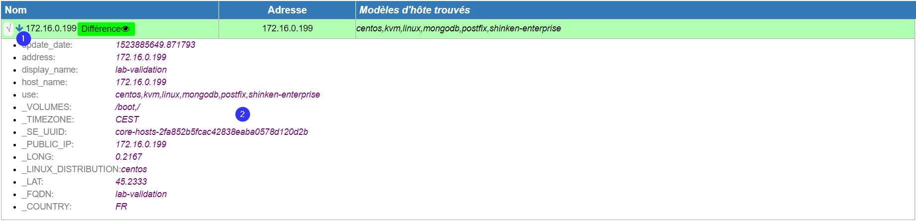 L'hôte scanné peut être signalé comme en différence avec un hôte déjà présent dans la base du Synchronizer de Shinken. Un lien sera présent pour accéder à la liste des éléments filtrés en Différence (1).
