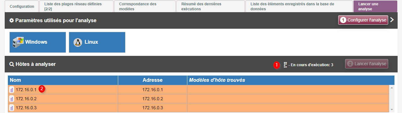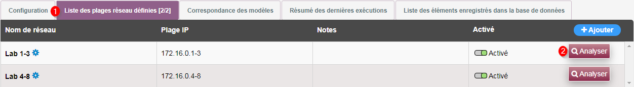 Après avoir configuré des plages réseaux (1) (voir configuration d'un analyseur). Il suffit de lancer l'analyse en cliquant que le bouton Analyser à droite de la ligne (2) :