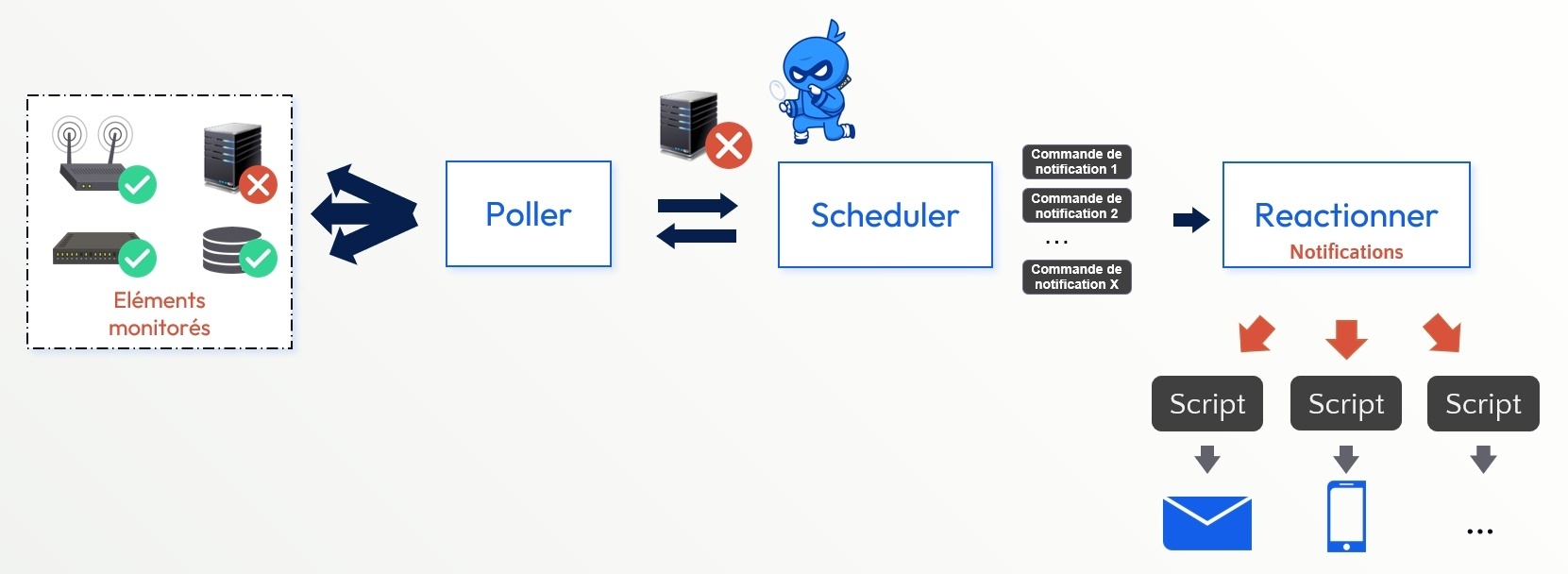Plus précisément, suivant le changement d'état d'un élément ( constaté par le Poller ), et la configuration définie sur cet élément, le Scheduler prépare les commandes pour notifier les utilisateurs de leur méthode de notification.