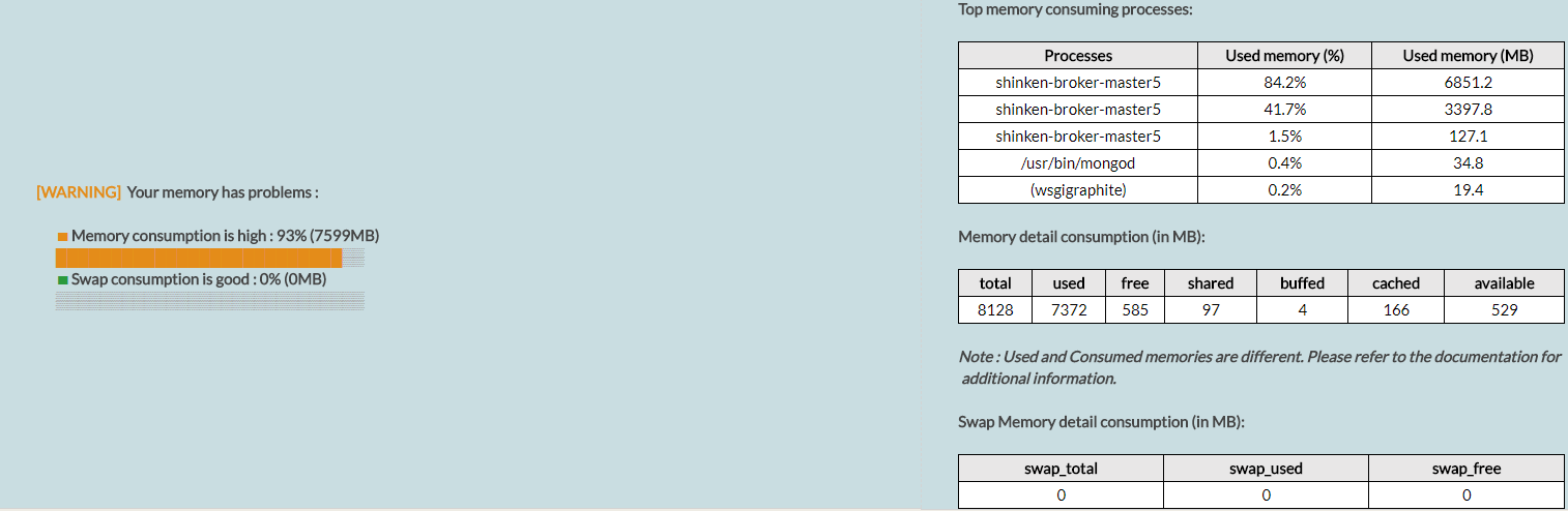 Le check Memory SSH va récupérer des informations concernant la mémoire vive et la mémoire swap de votre machine tel que le pourcentage utilisé et le top 5 des processus consommant le plus de mémoire. Contrairement aux autres checks, le statut de celui-ci possède 2 façons d'être modifié. Soit votre mémoire ram est trop élevé, soit votre swap est trop élevé. Le check est donc décomposé en "sous check" qui n'auront pas le même statut, le statut final est le plus mauvais des deux.