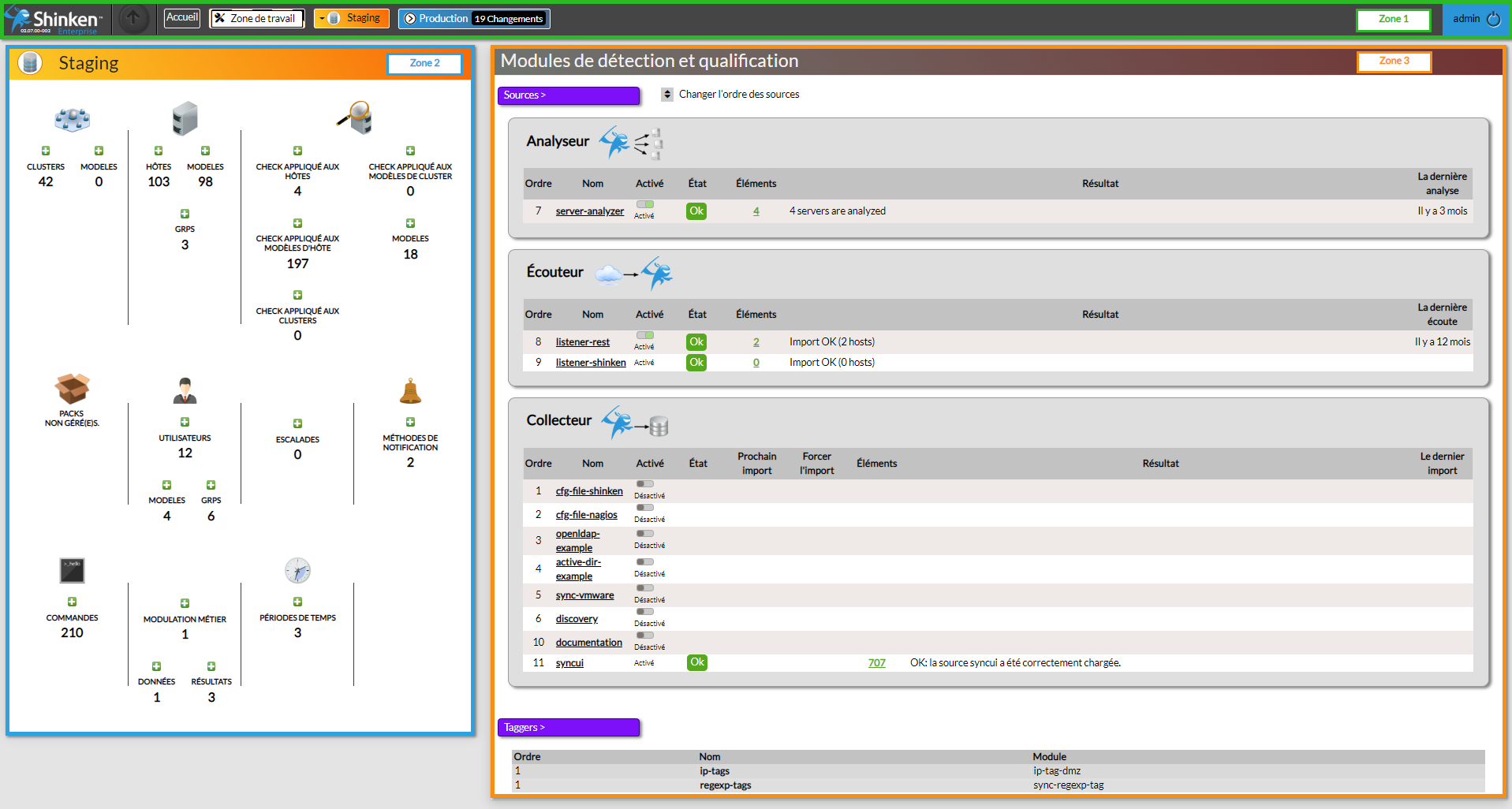 Pour chacune de ces catégories, chaque ligne permet d'accéder directement à la configuration correspondante en cliquant sur le nom de la source ou du tagger.