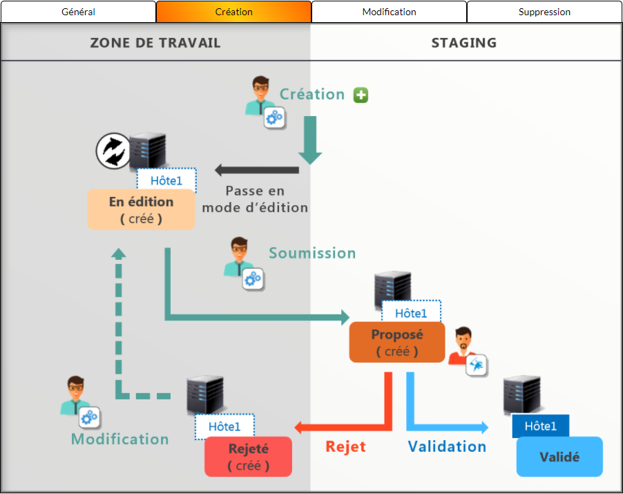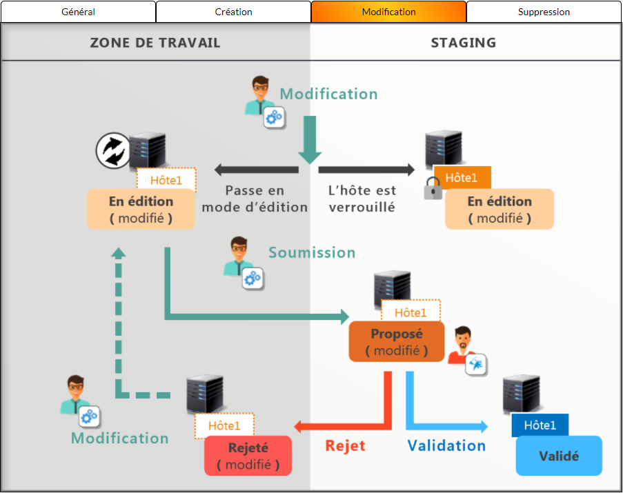 Dans le schéma, on peut voir que l'administrateur de SI modifie l'hôte 1. Lorsqu'il va sauvegarder ses modifications, l'hôte 1 va passer en statut "En édition ( modifié )" à la fois dans la Zone de travail et dans Staging. L'hôte va être verrouillé dans Staging afin d'empêcher les modifications à partir de l'hôte validé en Staging.