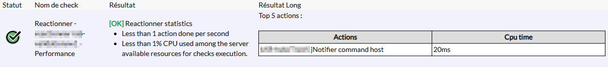 Le check Reactionner - $KEY$ - Performance affiche les statistiques des performances de l'exécution des checks dans le Reactionner
