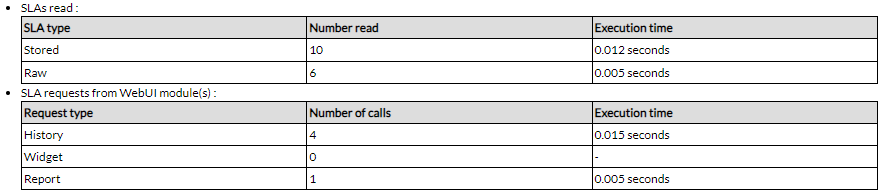 Dans le tableau des requêtes émises par le module SLA, les requêtes sont catégorisées entre les requêtes sur les données SLA stockées et les données SLA journalières non stockées.