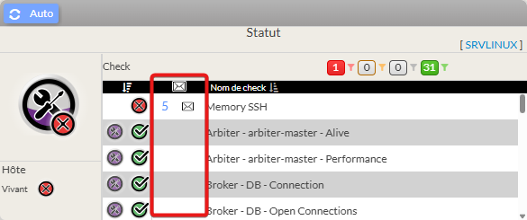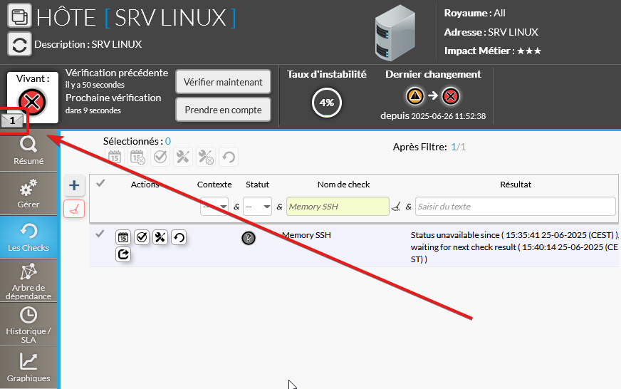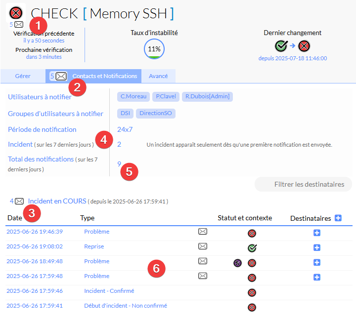 Dans l'exemple le check Memory SSH a un incident en cours avec cinq notifications déjà envoyées.