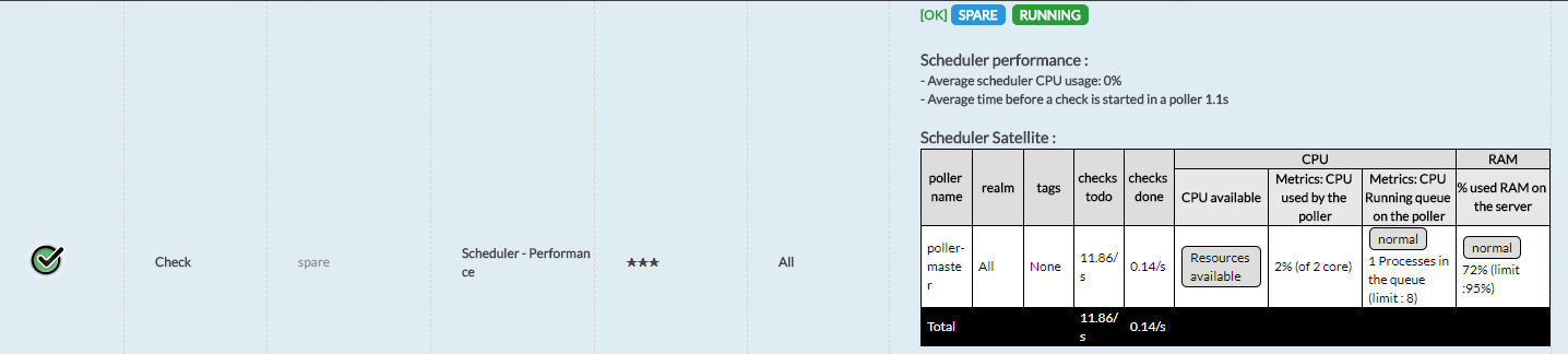 Par exemple ici le retour du check "Scheduler - Performance", indiquant une différence de version avec un Poller :