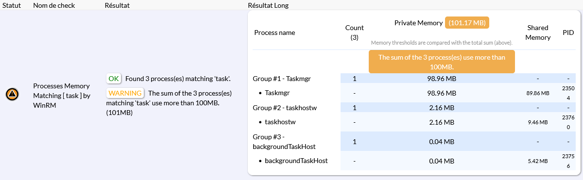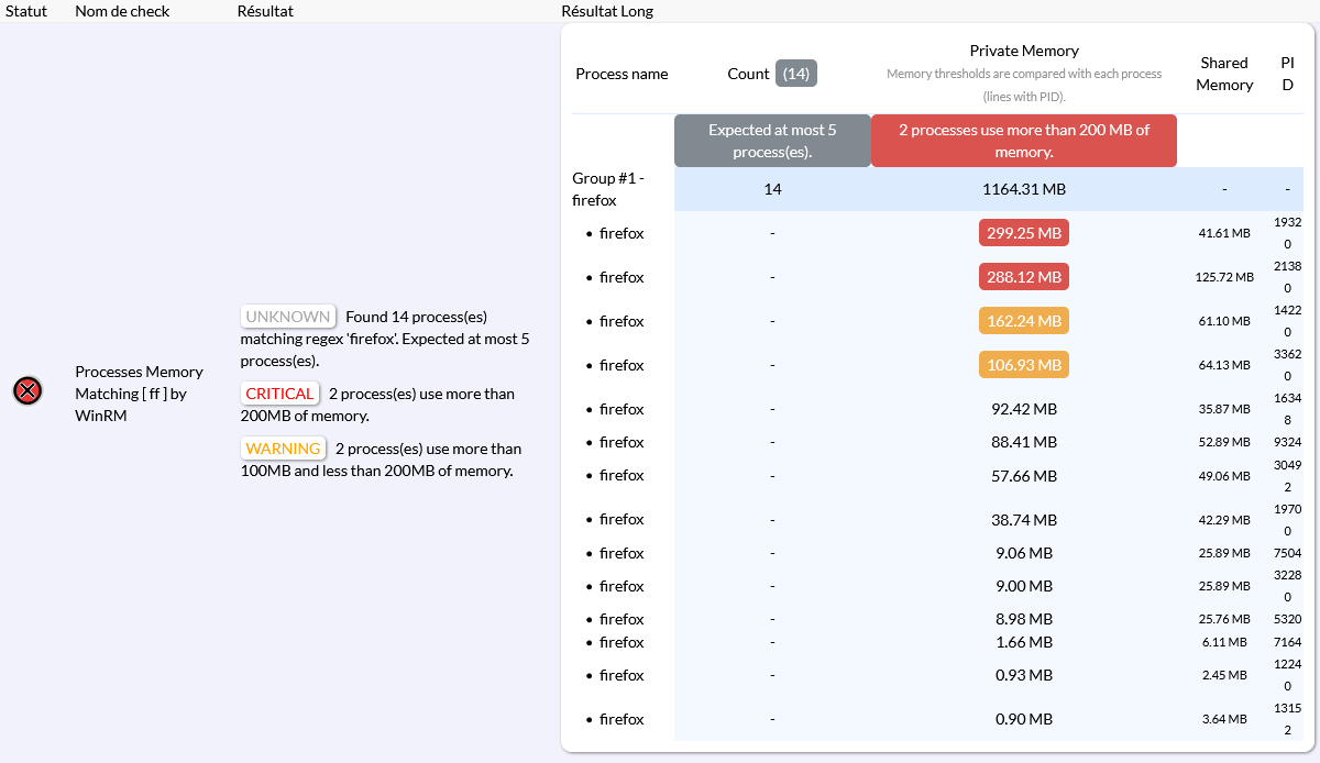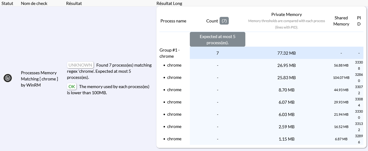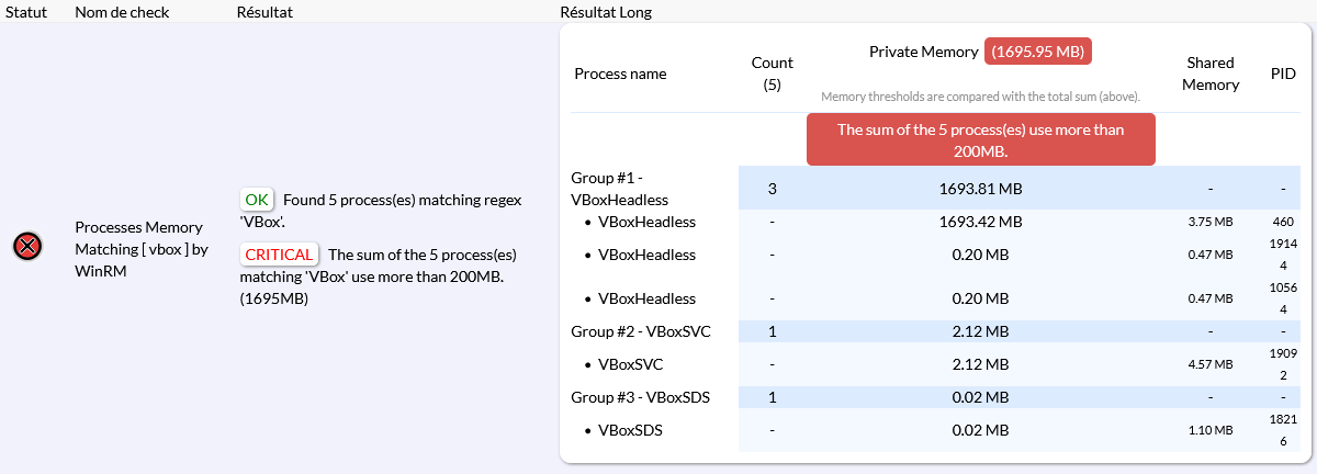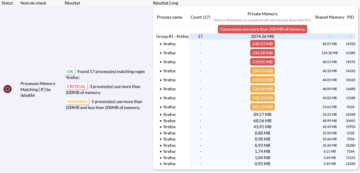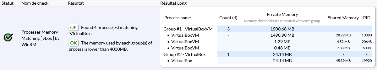 Le résultat contient un message indiquant le status, si le ou les processus ont été trouvés, si la somme, les groupe ou les processus ne dépassent pas les limites de consommation mémoire fixés et si assez ou trop peu de processus trouvés correspondent aux filtres.