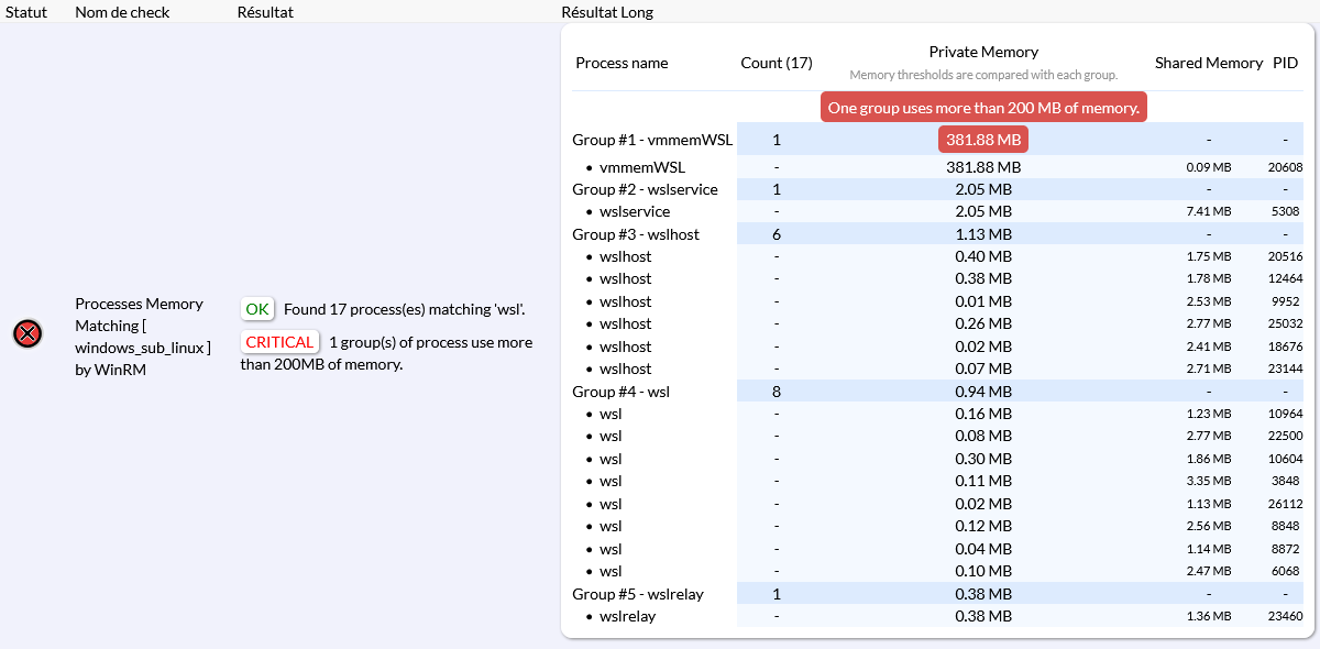 | ( nom_du_groupe_de_processus ) | MB | Consommation mémoire d'un groupe de processus en MB. Calculé à partir de la somme de la mémoire privée de chaque processus au sein du groupe. Généré pour chaque groupe de processus trouvé. | WINDOWS_BY_WINRM__PROCESSES-MEMORY-MATCHING__MEMORY-WARN. | WINDOWS_BY_WINRM__PROCESSES-MEMORY-MATCHING__MEMORY-CRIT. |