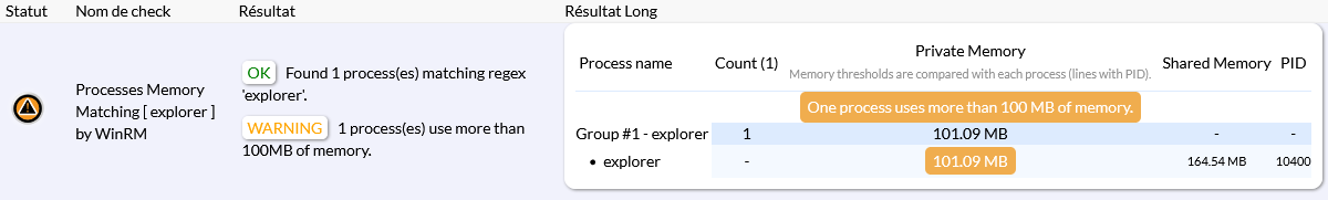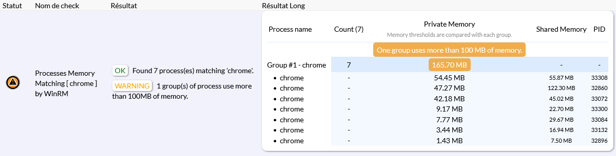 Le check Processes Memory Matching [ $KEY$ ] by WinRM permet de vérifier la consommation de la mémoire d'un seul ou plusieurs processus. Il permet donc de garder un œil sur le ou les processus choisis.