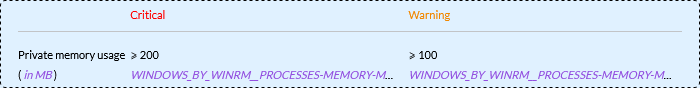 WINDOWS_BY_WINRM__PROCESSES-MEMORY-MATCHING__MEMORY-WARN | l'Hôte ( Onglet Données ) | MB | 100 | Seuil de consommation mémoire au-dessus duquel un status ATTENTION est déclenché |