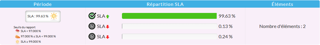 Ce résumé débute par le taux de disponibilité global, comprenant tous les statuts de tous les éléments sélectionnés pour la période complète.