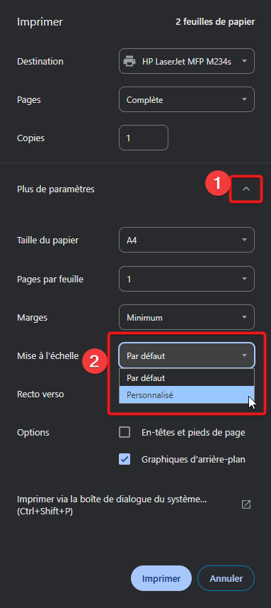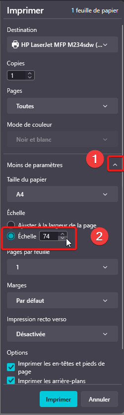 Pour réduire l'affichage, ouvrir l'onglet "Plus de paramètres" ( 1 ) puis activer l'option de mise à l'échelle ( 2 ) et jouer avec l'option de mise à l'échelle du navigateur, présente dans la boite de dialogue une fois l'impression demandé pour le faire rentrer sur une seule page.