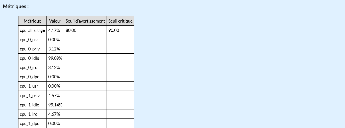 Toutes les métriques contenant le mot ( numerocpuNUMERO_CPU ) dans le tableau ci-dessus seront dupliquées en fonction du nombre de processeurs logique présents sur le serveur supervisé.