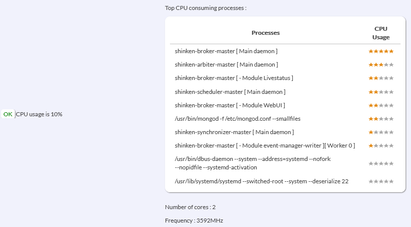 Le check CPU Stats SSH by SSH va utiliser des commandes à travers votre serveur SSH pour rechercher des informations sur votre CPU, tel que le nombre de coeurscœurs, la fréquence, le pourcentage d'utilisation du processeur au cours de la dernière seconde et pour finir, si votre utilisation du processeur est trop importante, les X processus utilisant consommant le plus gros du processeur de CPU ( X étant la donnée CPU_MAX_PROCESS modifiable dans la configuration ) avec une notation "étoile" permettant de voir quels processus sont les plus consommateurs.