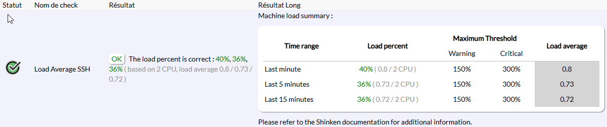 Le résultat contient un message indiquant le statut ainsi que le load average de la minute précédente ainsi que le load average des 5 et 15 dernières minutes.