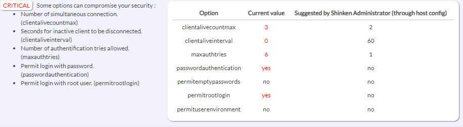 Le résultat long contient un tableau listant les paramètres sensibles de votre configuration SSH. Si le statut passe en CRITIQUE, une troisième colonne apparaît pour lister les valeurs recommandées.