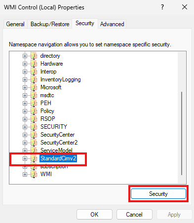 Accéder à la section Sécurité, puis dans l'arborescence ci-dessous, sélectionner Root > CIMV2 puis cliquer sur le bouton Sécurité situé en bas à droite.