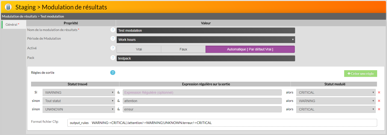L'interface de configuration permet de construire la règle de sortie de manière visuelle et interactive. L'interface affiche également la règle de sortie correspondante au format reconnu par les fichiers Cfg, afin de faciliter la création de modulations de résultats.