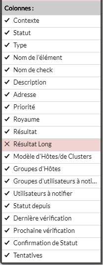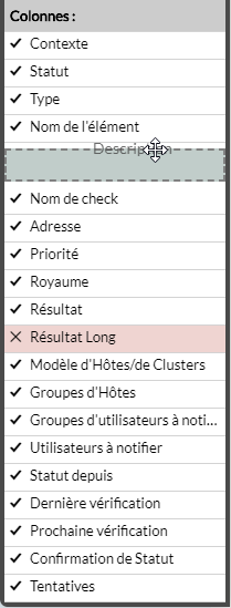 1. Cliquez sur le bouton  pour afficher, sous la section des réglages, la liste des colonnes affichées et désactivées.
