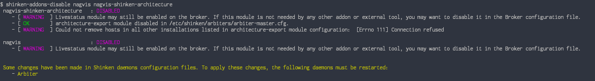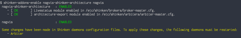 Les commandes d'activation et de désactivation peuvent entrer en conflit avec des changements de configuration manuels. Par exemple, l'activation des addons "nagvis" et "nagvis-shinken-architecture" activent le module Livestatus sur le Broker.