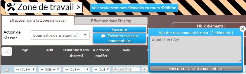 Cette action est équivalente à l'action du bouton "Soumettre dans Staging" de la page d'édition d'un élément. - Restaurer depuis Staging annule les modifications faites dans la zone de travail et repasse l'élément à son état de staging.