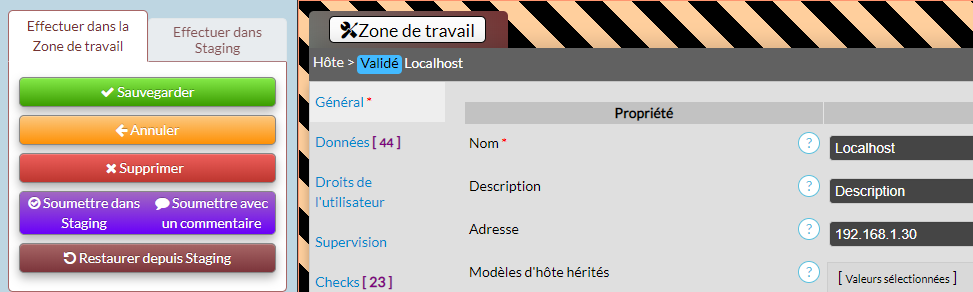 La Zone de travail permet de forcer la validation des modifications effectuées sur les éléments de supervision. Cette étape de validation permet de travailler avec un grand nombre d'utilisateurs ayant des droits différents, et permet un meilleur contrôle des modifications des éléments de supervision.