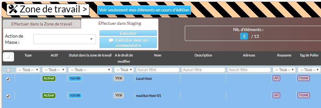 Lorsqu'on utilise les actions de masse dans l'onglet "Effectuer dans la Zone de travail", les hôtes se retrouvent dans un état de la Zone de travail (En édition ou Proposé). Ils devront par la suite être soumis puis être acceptés par un administrateur Shinken dans l'espace de Staging .