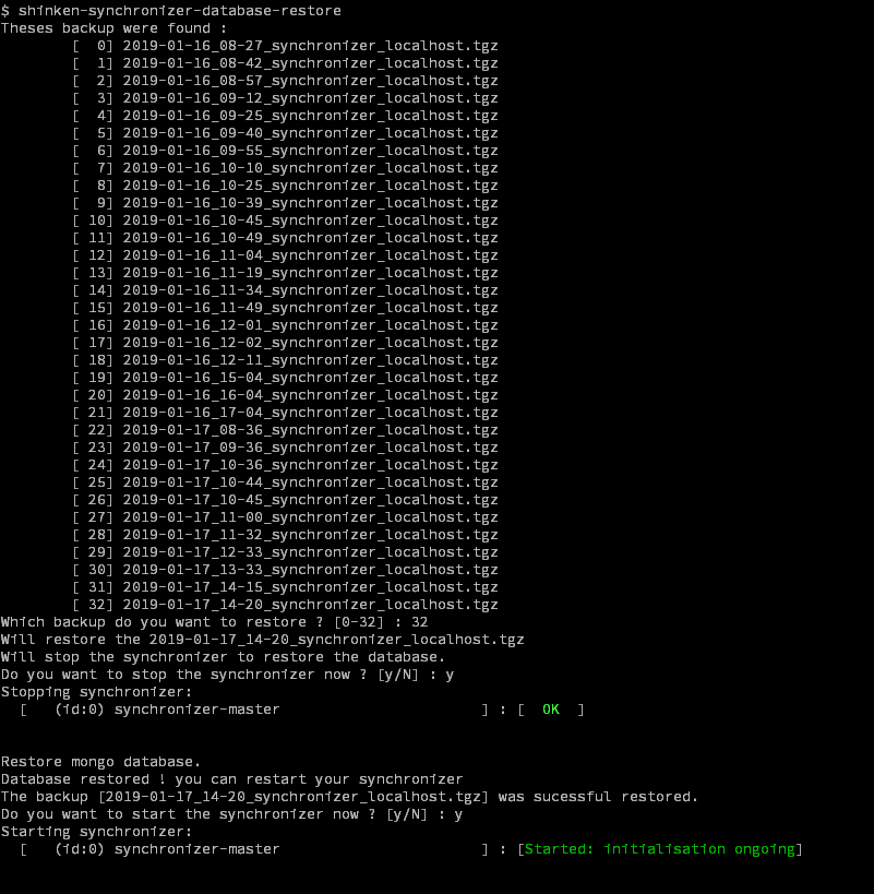 Afin que la restauration puisse être effectuée sans risque de corruption de données, shinken-synchronizer-database-restore vous demandera votre accord pour arrêter le Synchronizer durant la procédure de restauration.