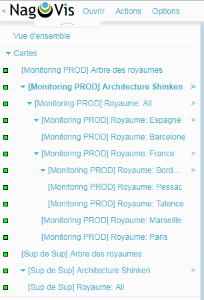 Le résultat des ces opérations est la présence de cartes et d'hôtes permettant de visualiser l'architecture de la plateforme secondaire (Sup de Sup) et de la plateforme principale (Monitoring PROD):