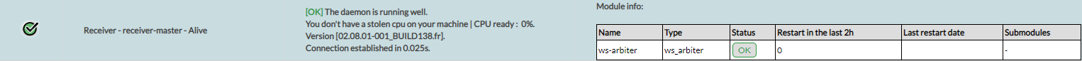 Vérifie que le démon Receiver peut être correctement contacté sur le réseau ( Résultat court ) et que les modules sont opérationnels ( Résultat long ).