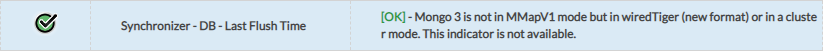 Sur une installation neuve de Shinken, le nouveau format (WiredTiger) est utilisé, ce qui rend le " Synchronizer - DB - Last Flush Time " non pertinent. Dans ce cas, ce check aura le résultat suivant: