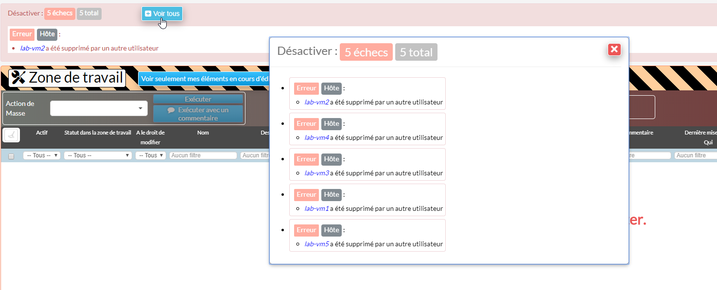 En cas d'échec de l'action un message est remonté à l'utilisateur au dessus de la liste.